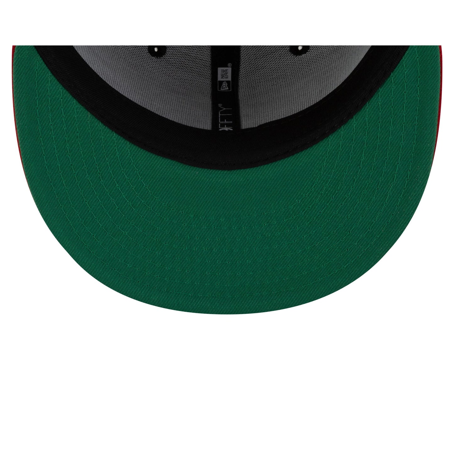 The Wisconsin Timber Rattlers Black Food Pack 59FIFTY Fitted Cap features an embroidered Timber Rattlers pizza oven themed logo at the front panels with a matching MiLB Batterman logo at the rear. Additional details include a Frozen Pizzas team wordmark at the right-wear side with a red visor and a green undervisor.