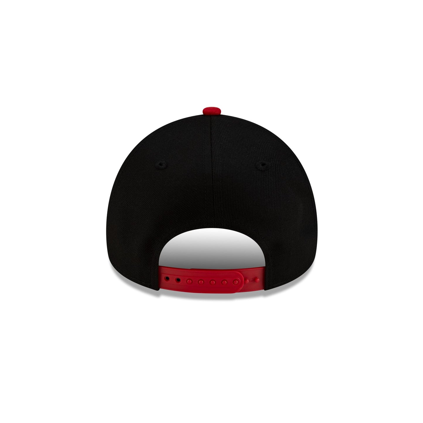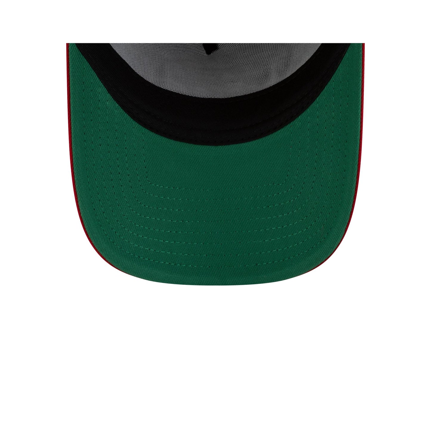 The Wisconsin Timber Rattlers Black Food Pack 9FORTY A-Frame Snapback features an embroidered Timber Rattlers pizza oven themed logo at the front panels with a snapback closure logo at the rear. Additional details include a Frozen Pizzas team wordmark at the right-wear side with a red visor and a green undervisor.