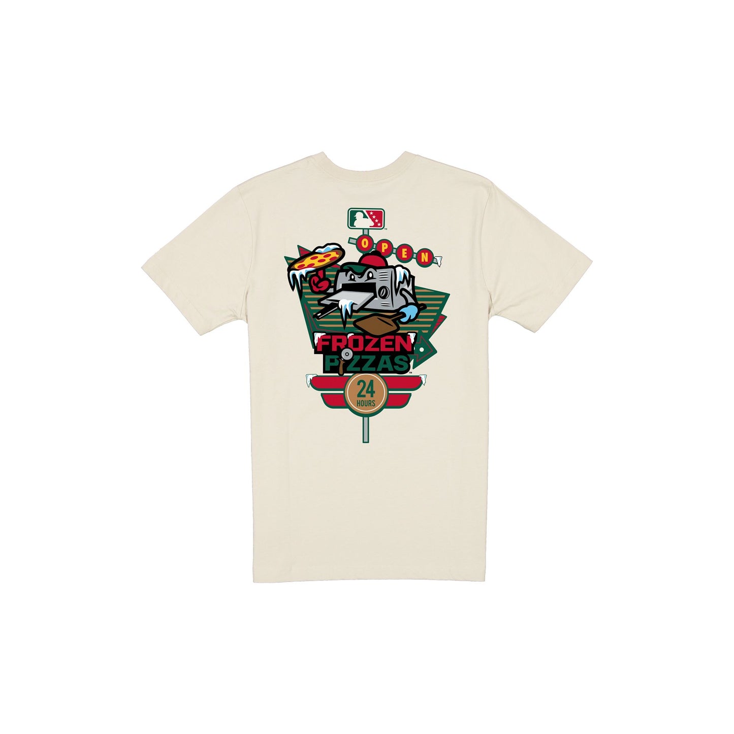 The Wisconsin Timber Rattlers Chrome Food Pack T-Shirt features a screen-printed Timber Rattlers Frozen Pizzas themed logo at the left chest with a matching graphic at the rear.