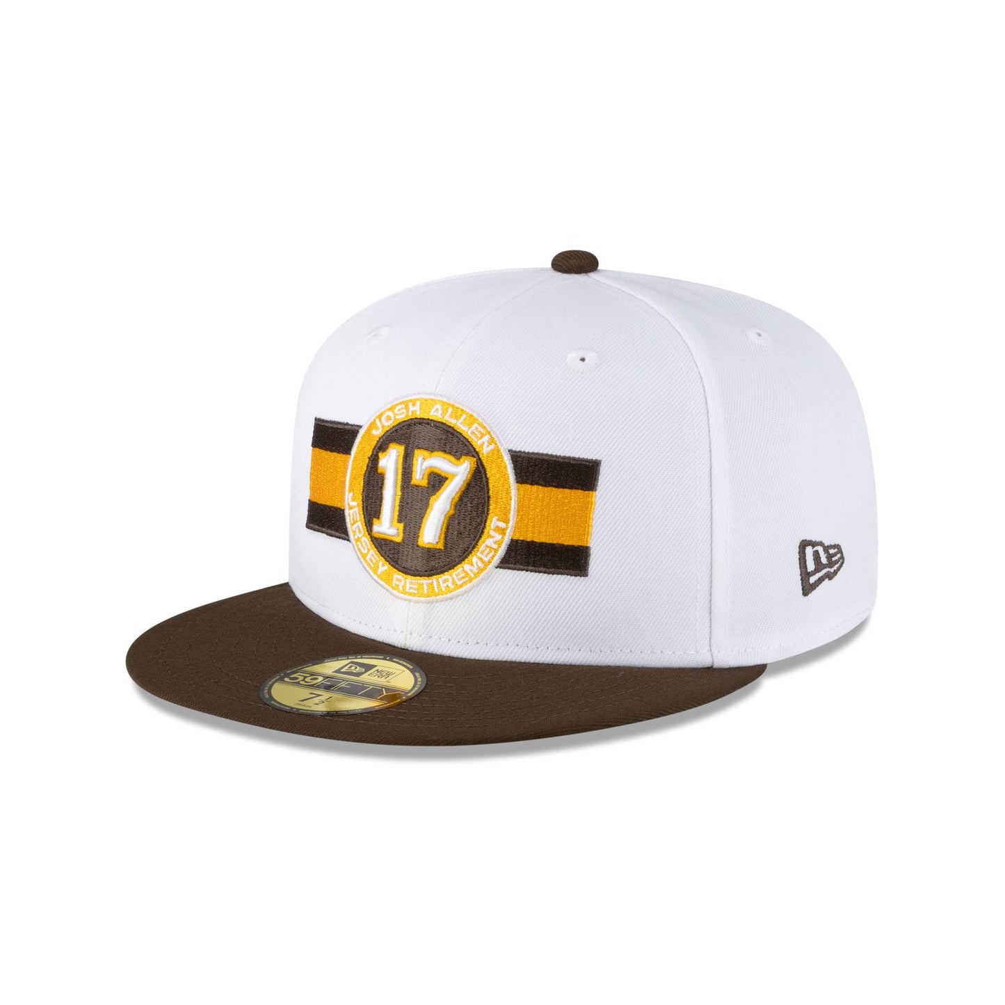 The Wyoming Cowboys Josh Allen Jersey Retirement 17 59FIFTY Fitted Cap features an embroidered Cowboys 17 circle graphic at the front panels with a gray undervisor.