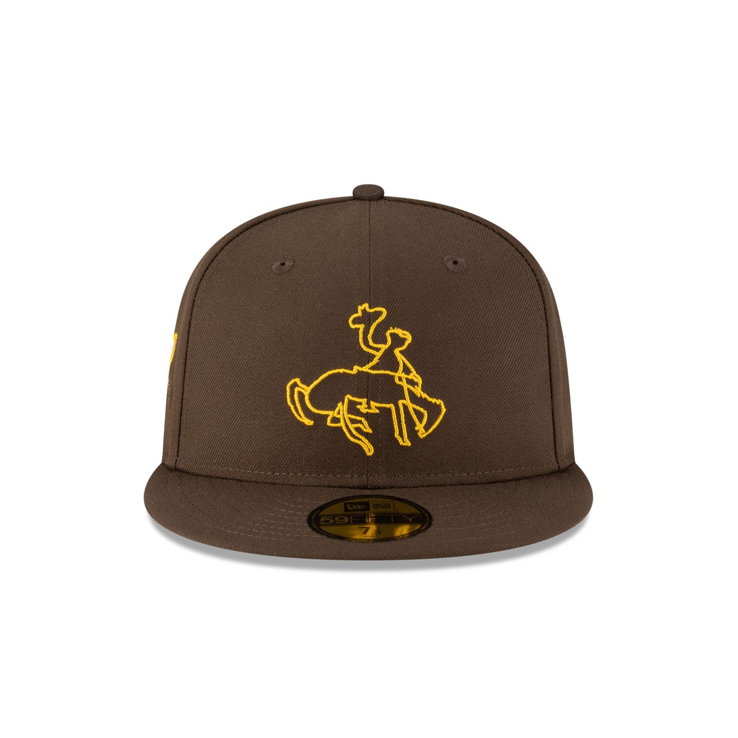 The Wyoming Cowboys Josh Allen Jersey Retirement Cowboy 59FIFTY Fitted Cap features an embroidered Cowboy at the front panels with Josh Allen's name an number at the right-wear side and a gray undervisor.