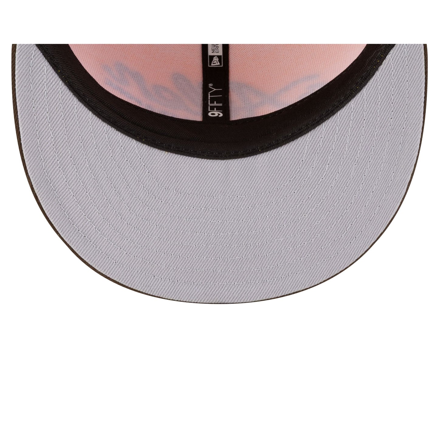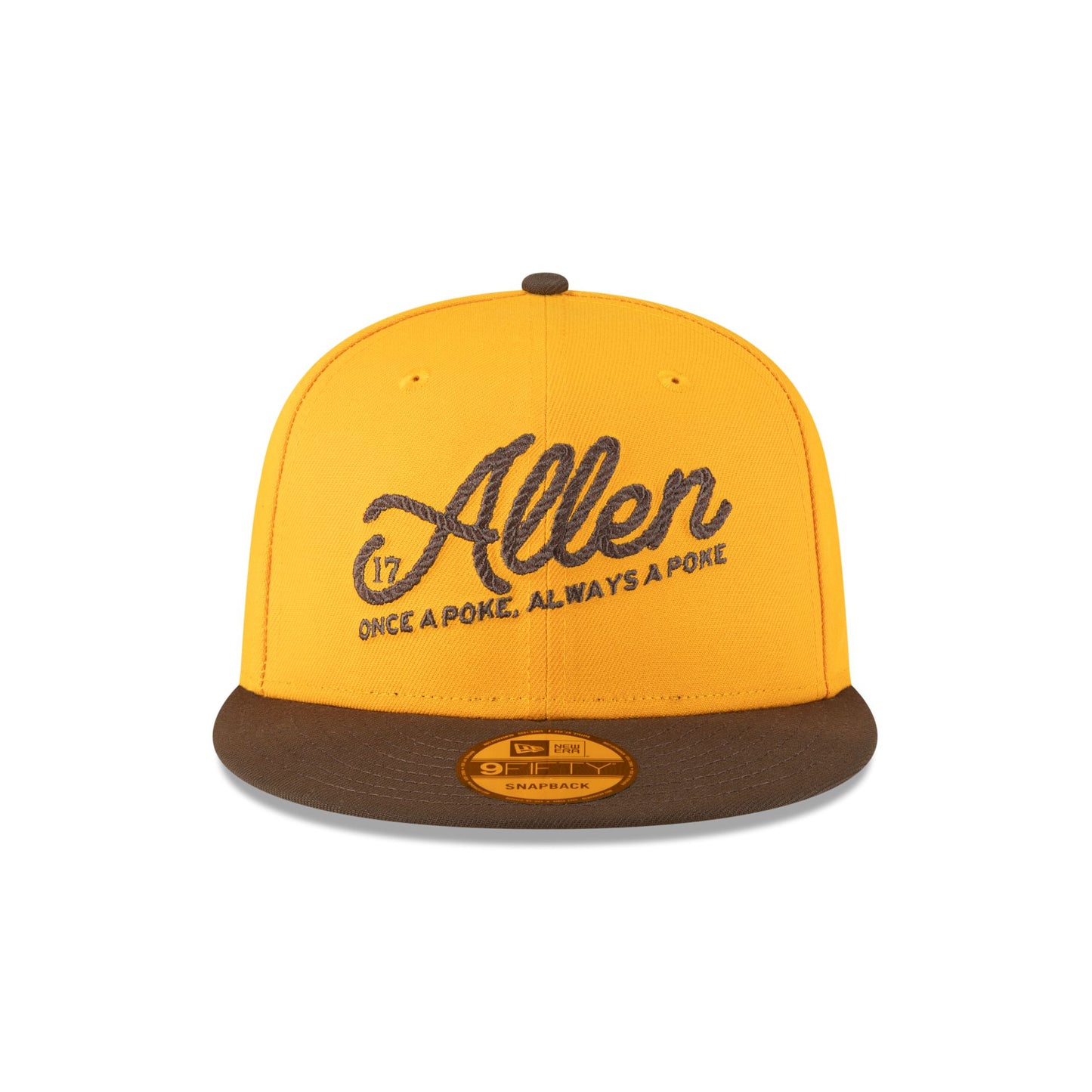 The Wyoming Cowboys Josh Allen Jersey Retirement Gold 9FIFTY Snapback features an embroidered Cowboys Allen script wordmark at the front panels that reads "Allen. One a Poke, Always a Poke." Additional details include a Cowboys logo at the right-wear side, an adjustable snapback closure at the rear, and a gray undervisor.