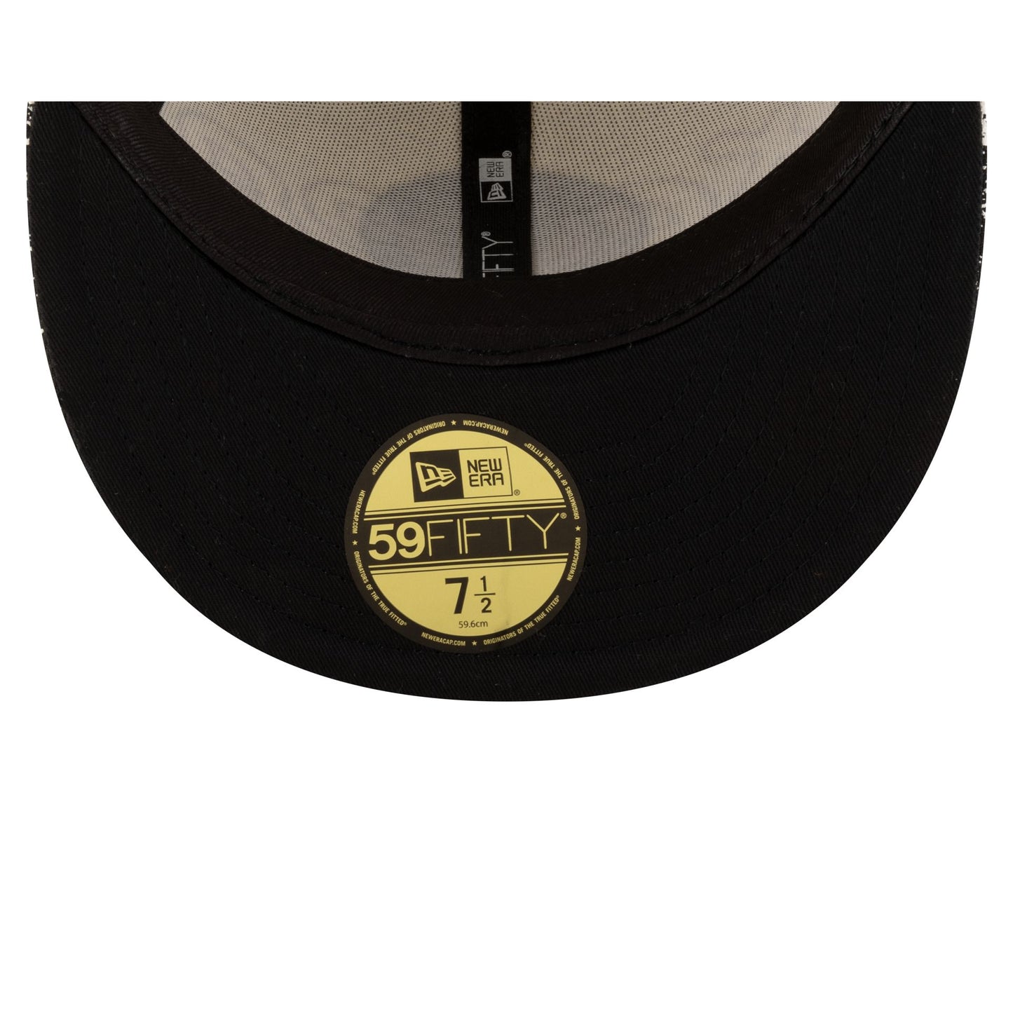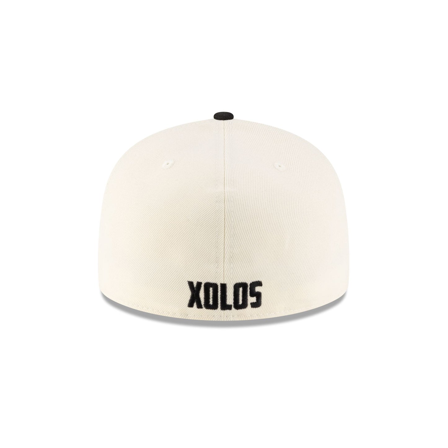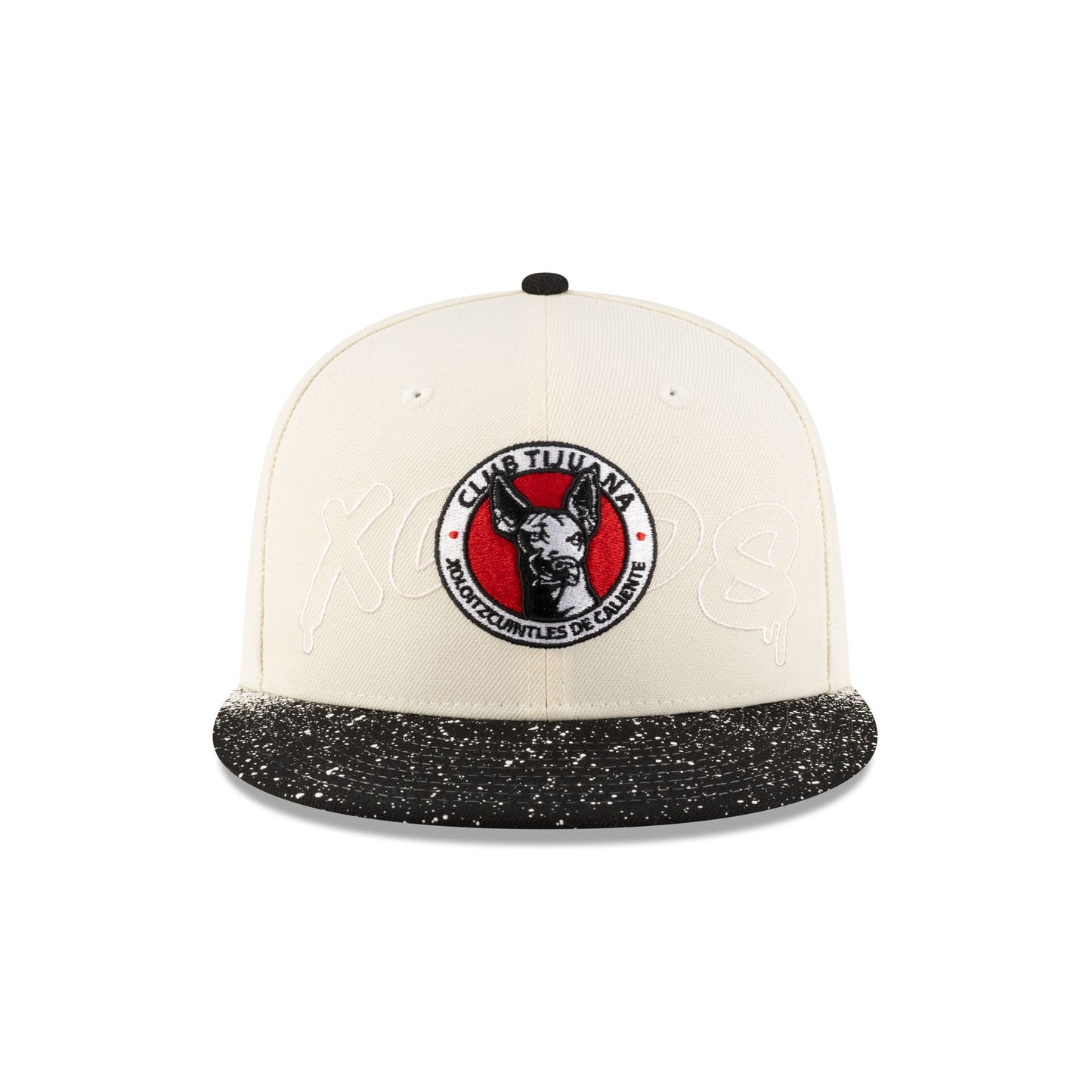 The Xolos Splattered Visor 59FIFTY Fitted Cap features an embroidered Xolos graffiti wordmark with a layered logo on top and a paint splatter detailed visor. Additional details include a team wordmark at the rear and a black undervisor.