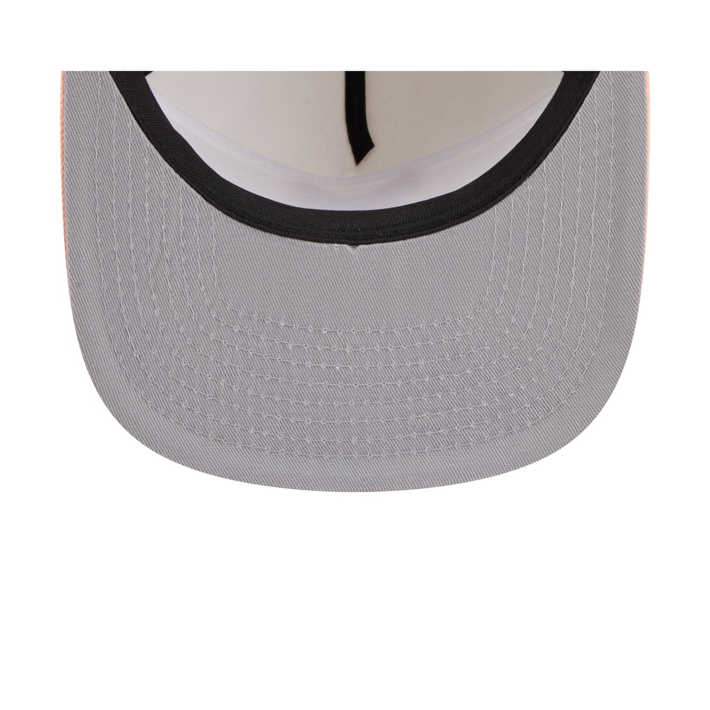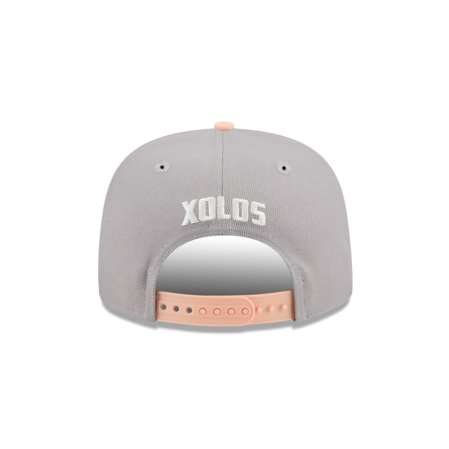 The Xolos Two-Tone Gray 19TWENTY Snapback features a peach embroidered Xolos logo at the front panel with a team wordmark above an adjustable snapback closure at the rear gray panels, a peach visor, and a gray undervisor.