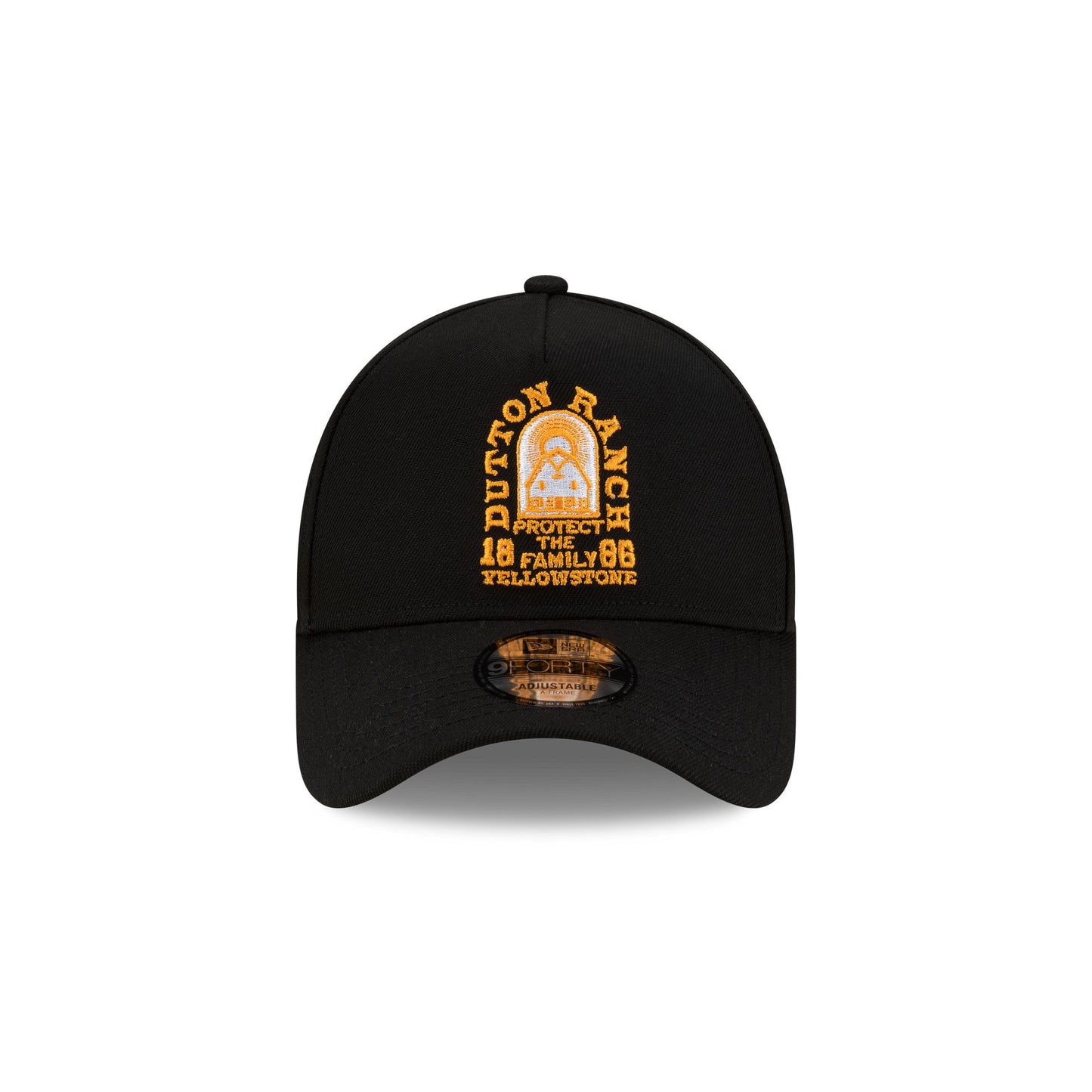 The Yellowstone Black 9FORTY A-Frame Snapback features an embroidered Yellowstone Dutton Ranch graphic at the front with an adjustable snapback closure at the rear and a gray undervisor.