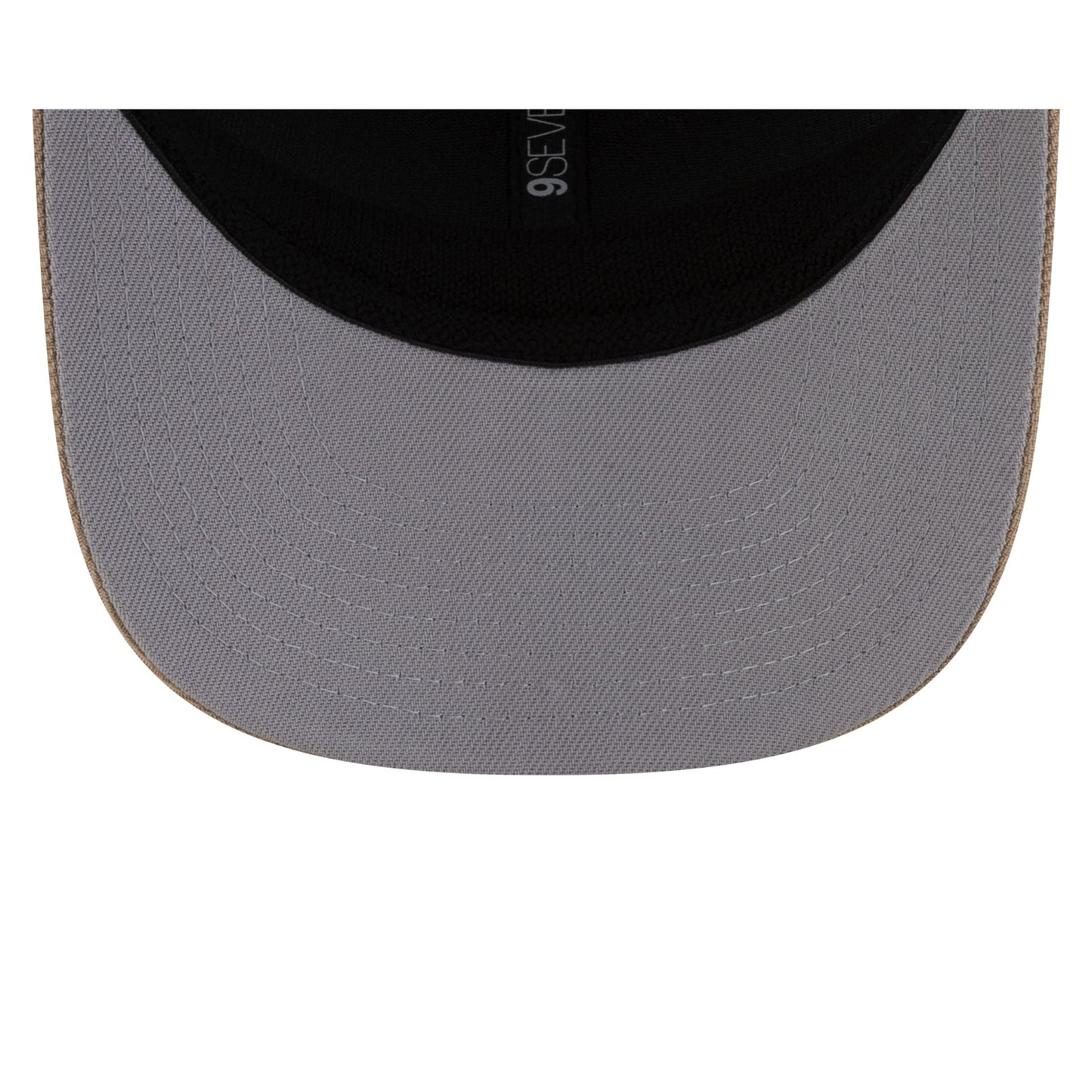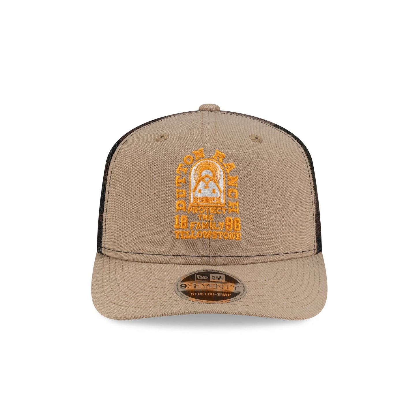 The Yellowstone Camel 9SEVENTY Trucker features an embroidered Yellowstone Dutton Ranch graphic at the front with an adjustable stretch-snap closure at a mesh rear and a gray undervisor.