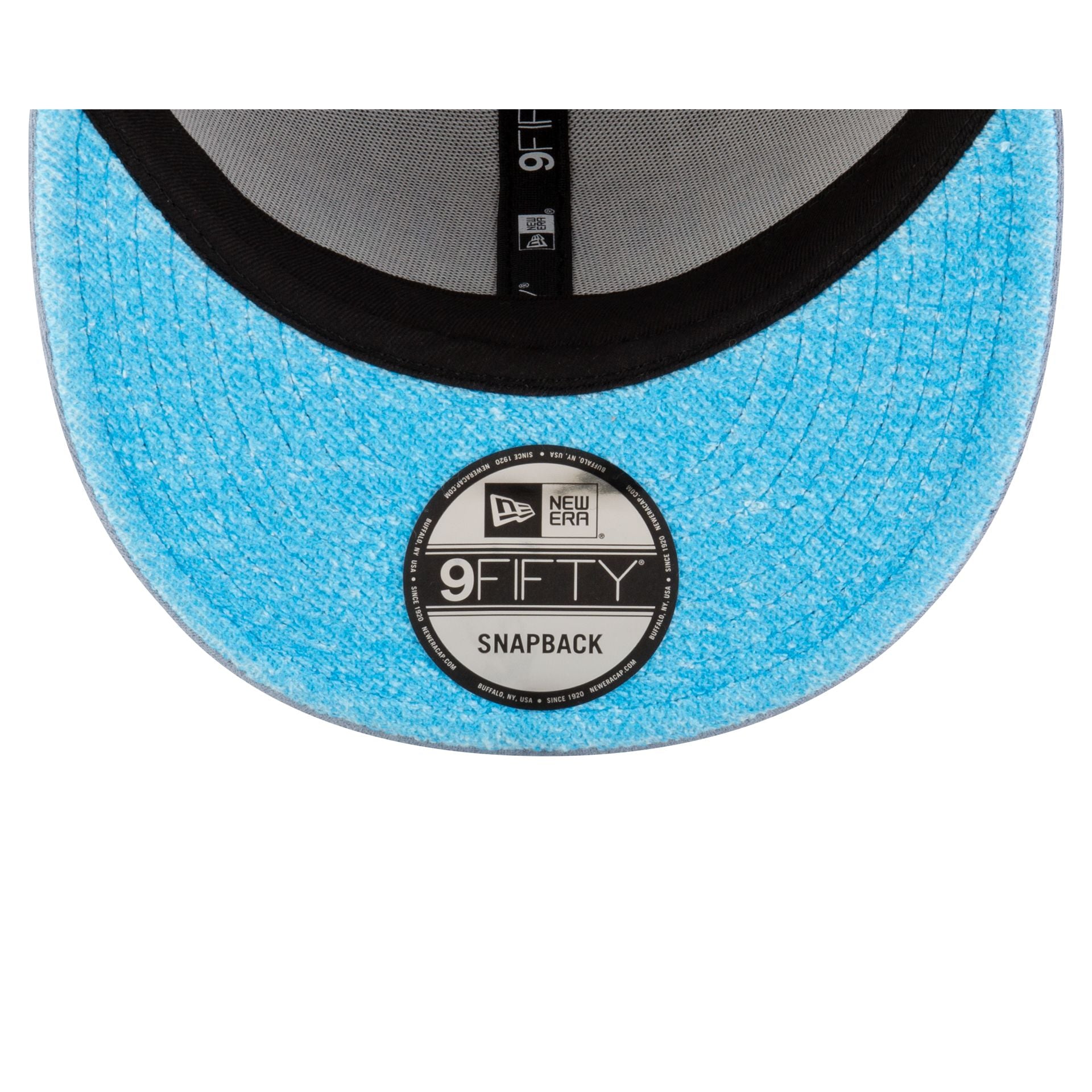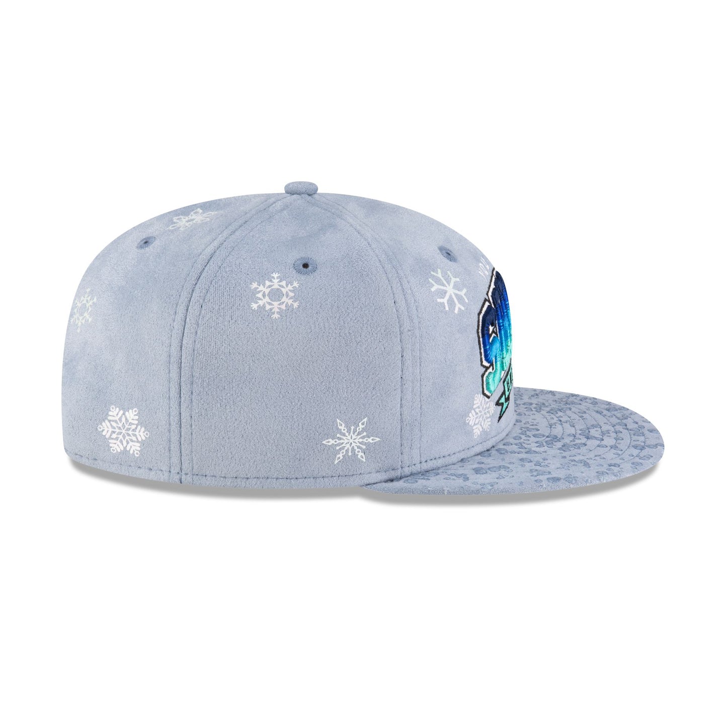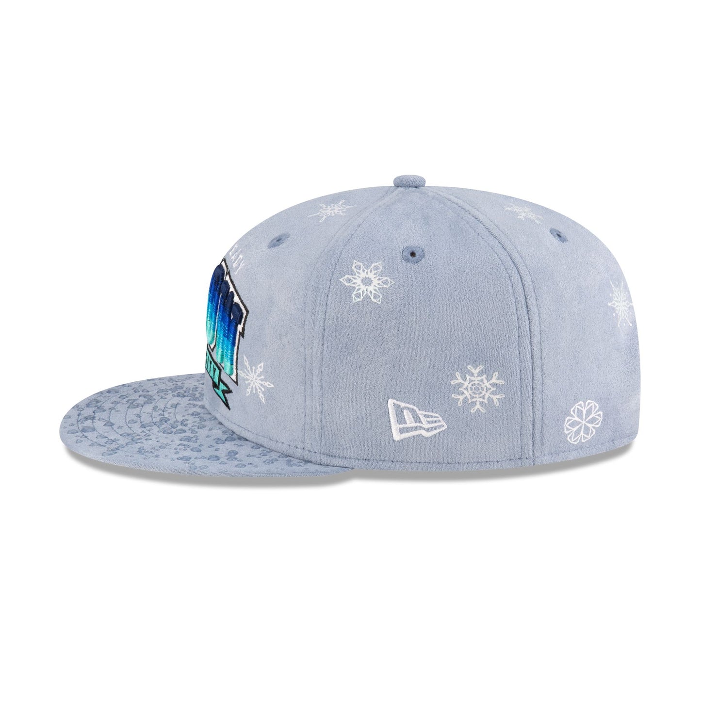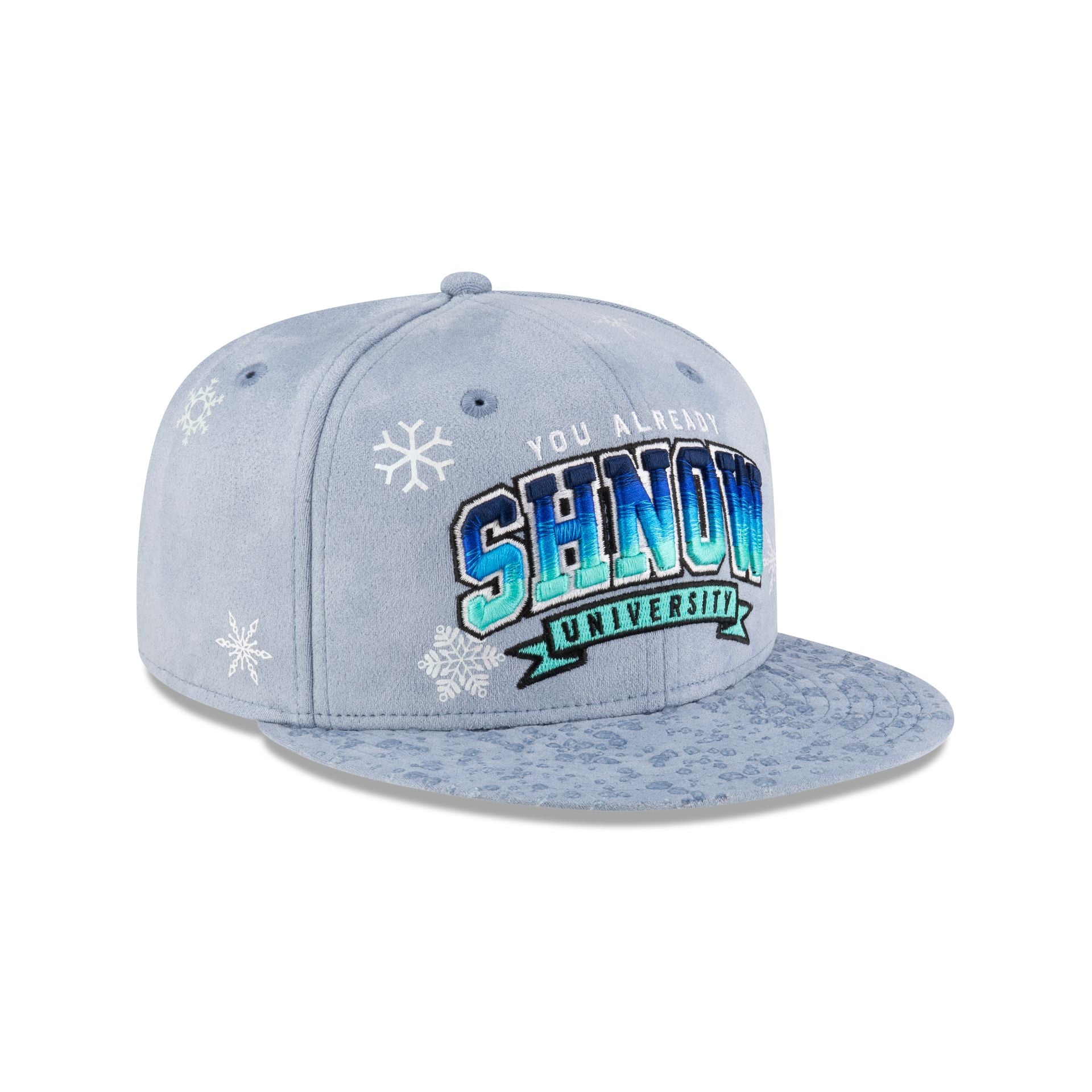 The You Already Shnow University 9FIFTY Snapback features an embroidered Shnow University logo at the front panels with faux water droplets at the visor. Additional details include a Buffalo above a snapback closure at the rear and a blue undervisor.